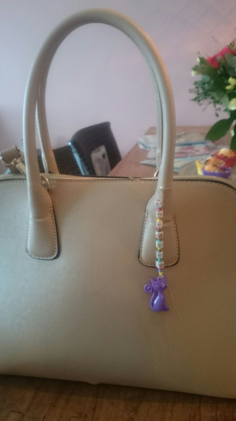 Gemaakt van ronde kralen en vierkante met letters en een kat aan het einde.