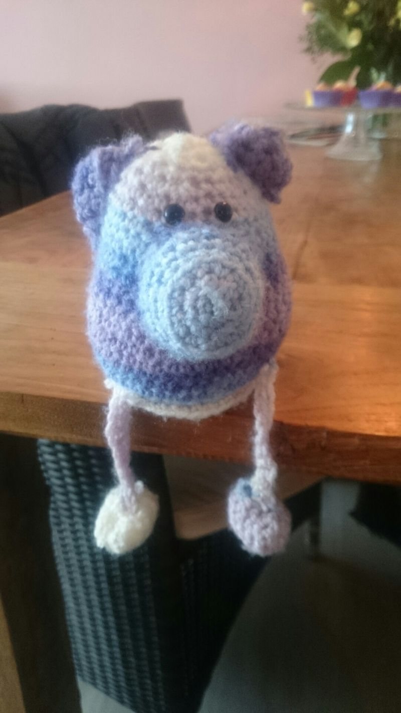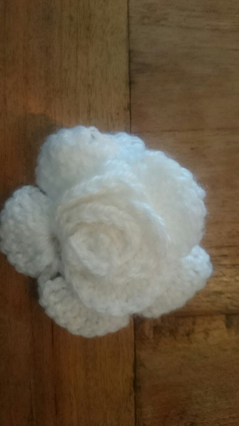 Gehaakt van wol en voorzien van veiligheidsspeld voor bevestiging.